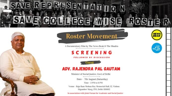 विगत 7 अगस्त को रोस्टर आंदोलन पर बनी एक डाक्यूमेंट्री फिल्म की स्क्रीनिंग का पोस्टर जारी हुआ। स्क्रीनिंग का आयोजन दिल्ली में आईटीओ के नजदीक राजा राम मोहन राय मेमोरियल हॉल में किया गया। बहुत सारे लोगों को सोशल मीडिया चैनलों के जरिए जब ये खबर पहुँची कि राष्ट्रव्यापी ऐतिहासिक रोस्टर आंदोलन पर कोई डाक्यूमेंट्री फिल्मायी गयी है तो सबके मन में हर्ष एवं उल्लास का भाव तैरने लगा। विशेषकर वो लोग जो इस ऐतिहासिक आंदोलन के शिल्पकार, सक्रिय सहभागी एवं साक्षी रहे हैं। इस स्वागतयोग्य व सराहनीय प्रयास हेतु निर्माता टीम एवं निर्देशक के लिए प्रशंसा के स्वर मन में फूटना स्वाभाविक था।